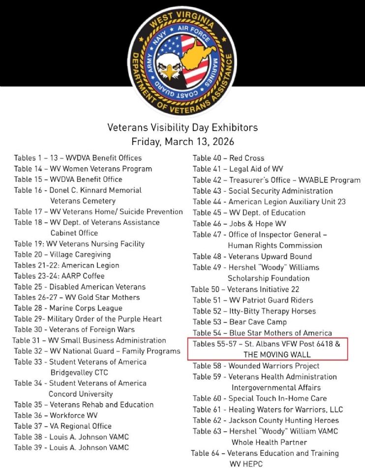 Friday, March 13, 2026. 9 a.m. to 1 p.m.  A very good day for West Virginia Veterans AND VFW POST 6418 & THE MOVING WALL. Talked to a lot of folks and made new friends.